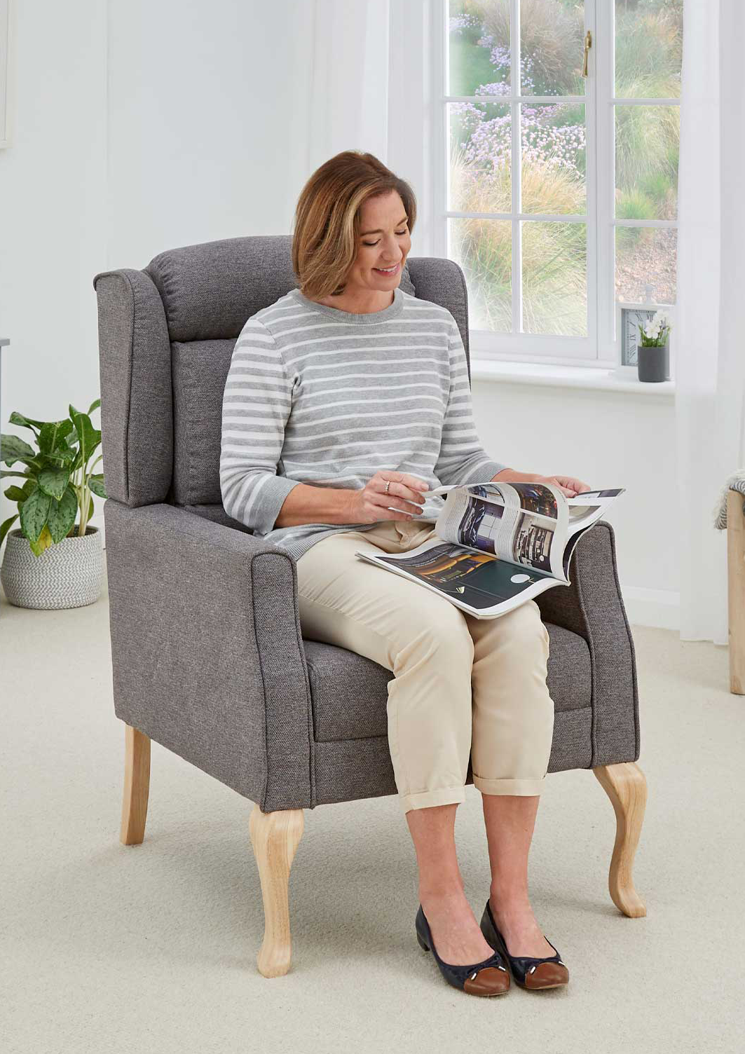 Designed to encourage good posture, fireside chairs provide supportive armrests and an upright design to make sitting and standing feel easier while offering a comfortable place to relax at home.