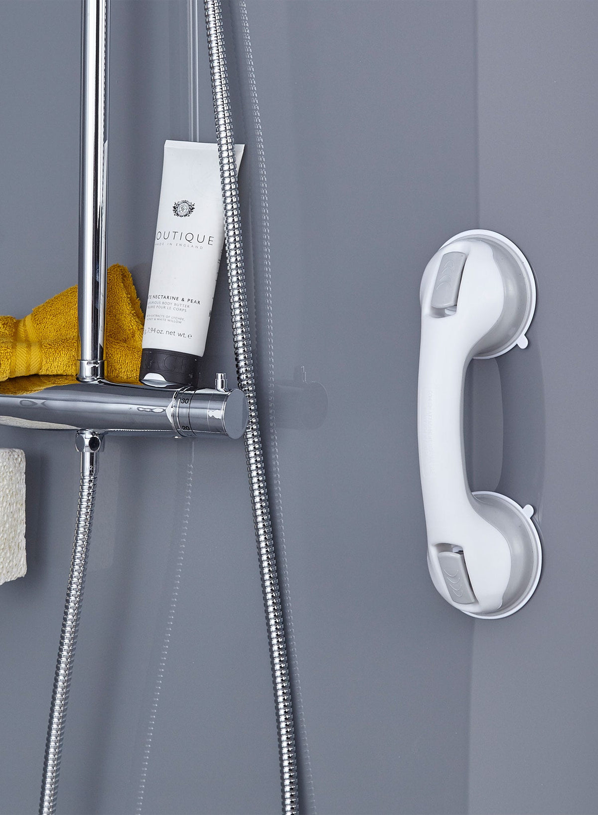 Large rubber suction cups at each end lock into place using simple pressure switches, creating a strong vacuum seal on smooth, non-porous surfaces such as tiles or glass. This gives you a secure handhold where you need it most.