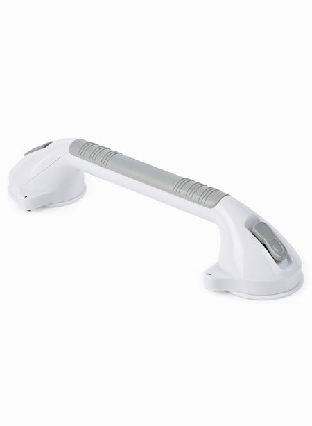 Pressure switches at each end lock and unlock the suction cups, making the bar easy to apply and remove without tools. The longer length offers a more generous gripping area, ideal beside a bath or along a shower wall.