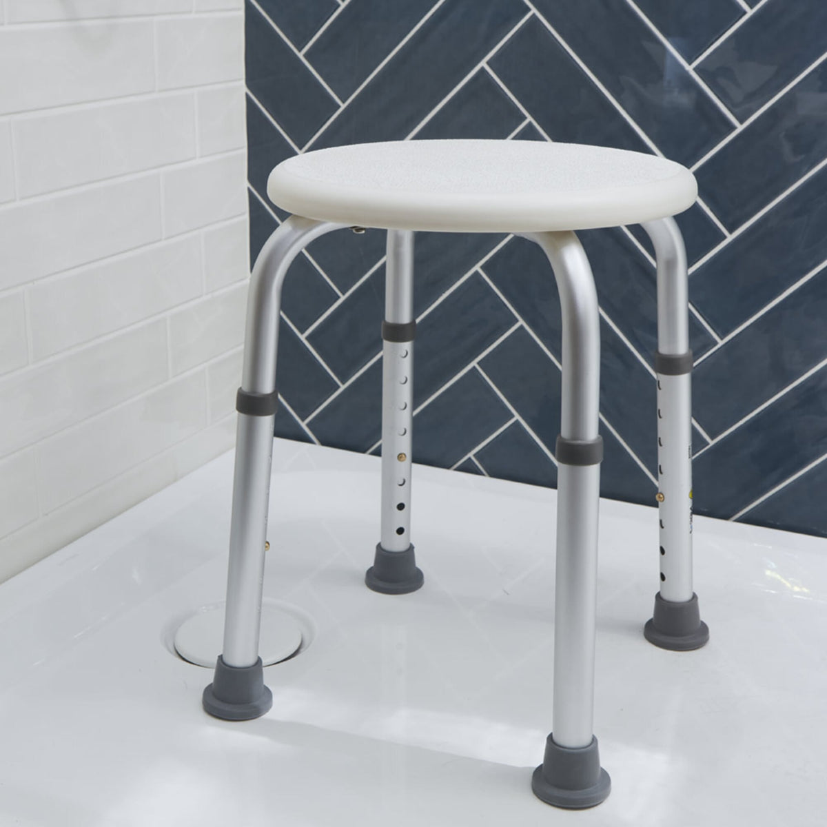 This neat shower stool has a moulded plastic circular seat on a sturdy, lightweight frame, giving you a stable base to sit on whilst you wash in the shower.