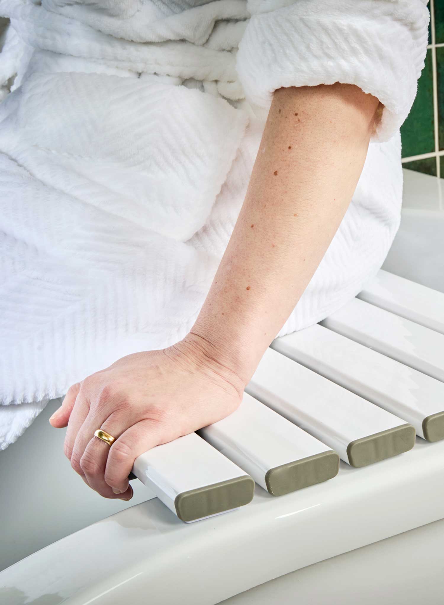 Placed across the top of the bath, it lets you sit securely and slide towards the centre of the tub to wash, without blocking most shower fittings. You can stay at a higher level rather than having to get all the way down to the bottom of the bath.