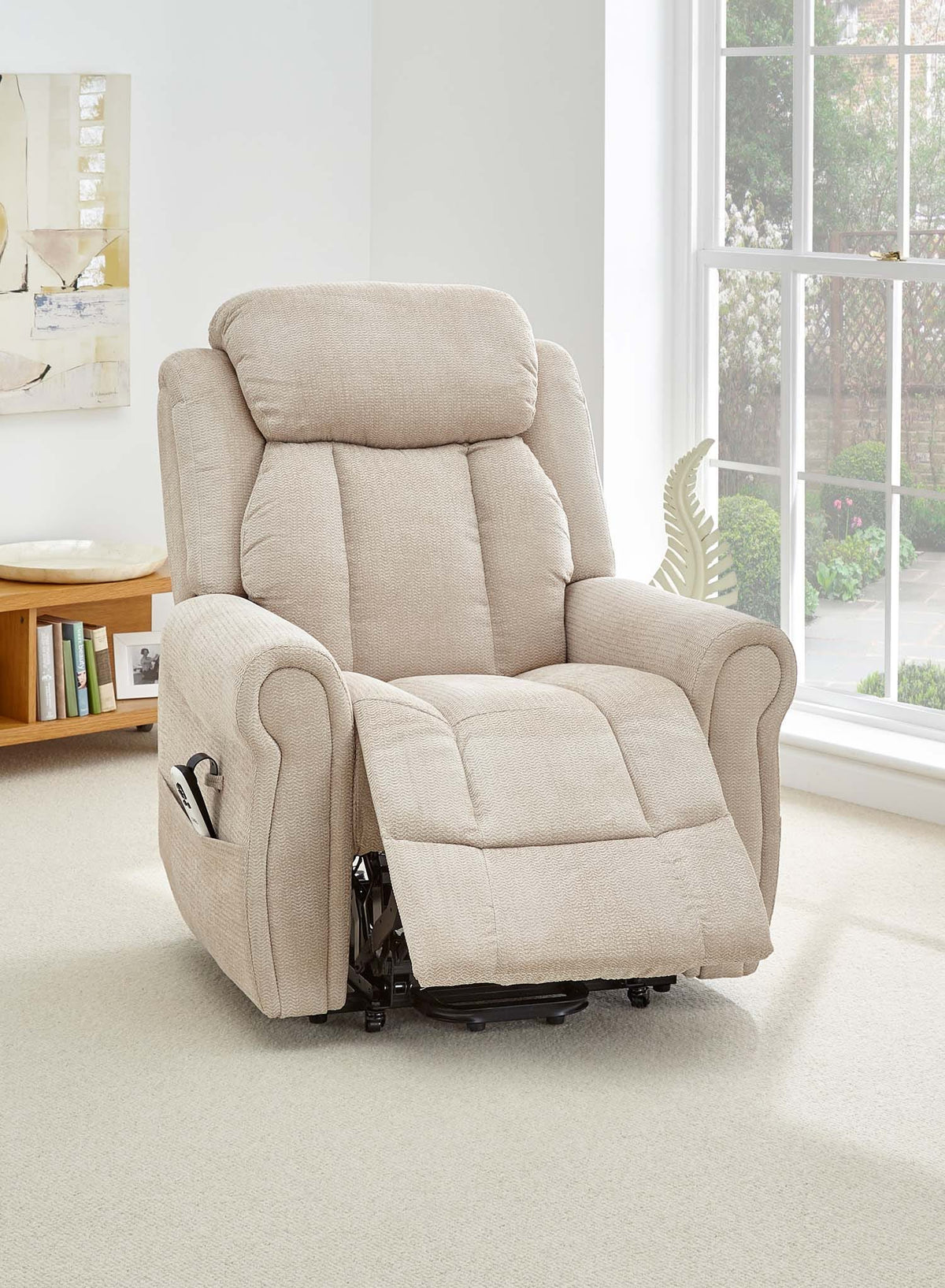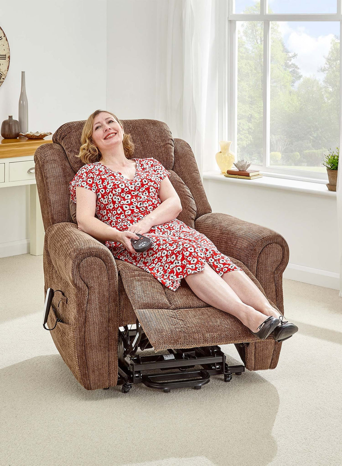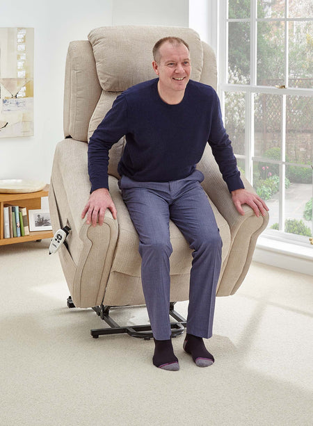 The dual motor action means the backrest and footrest move independently. You can sit upright with your feet raised, recline your back while keeping your feet on the floor or fully recline if you want to rest or nap in the chair. A simple, easy-to-hold handset lets you move smoothly between lift, sit and recline positions at the touch of a button.