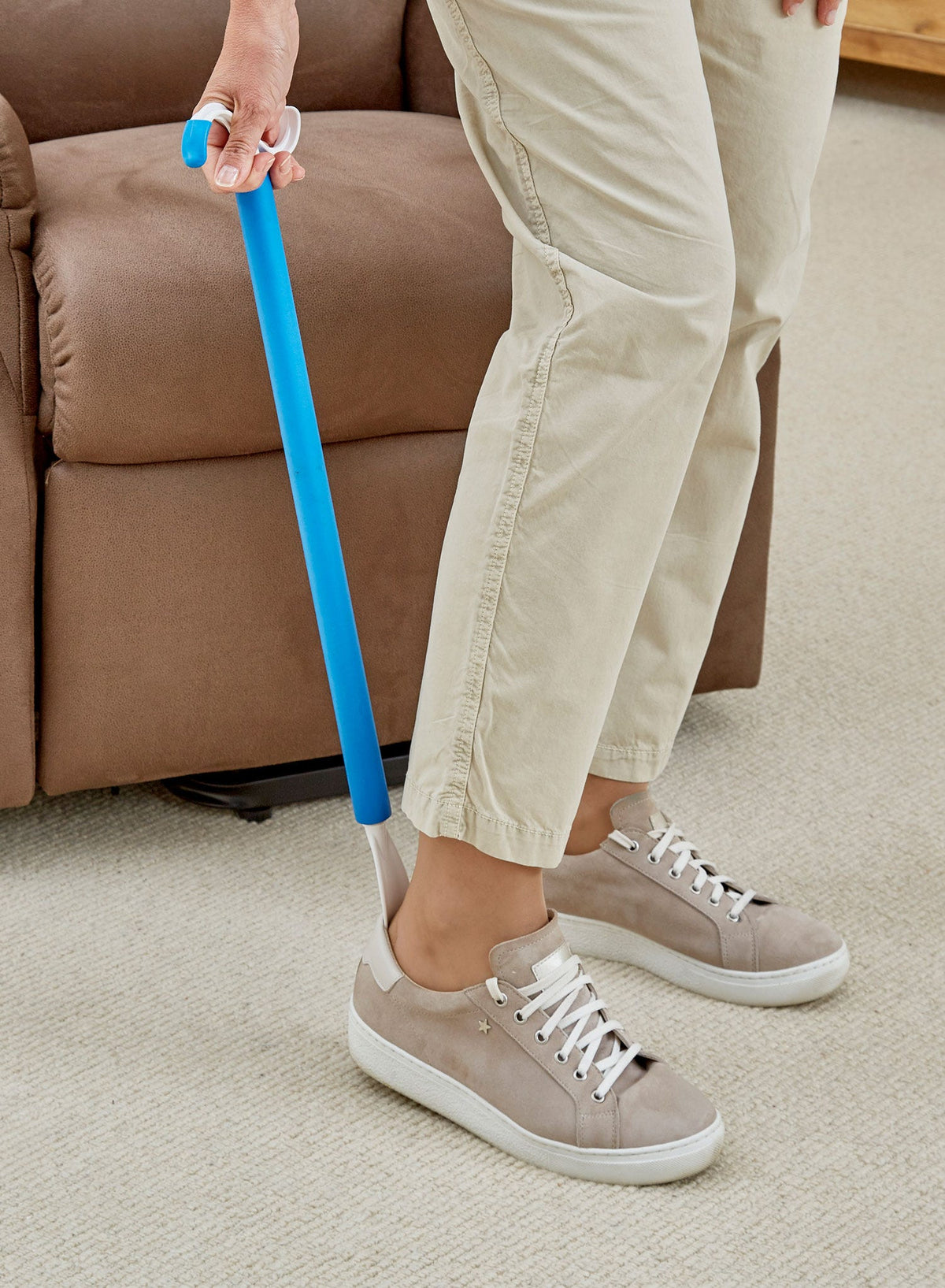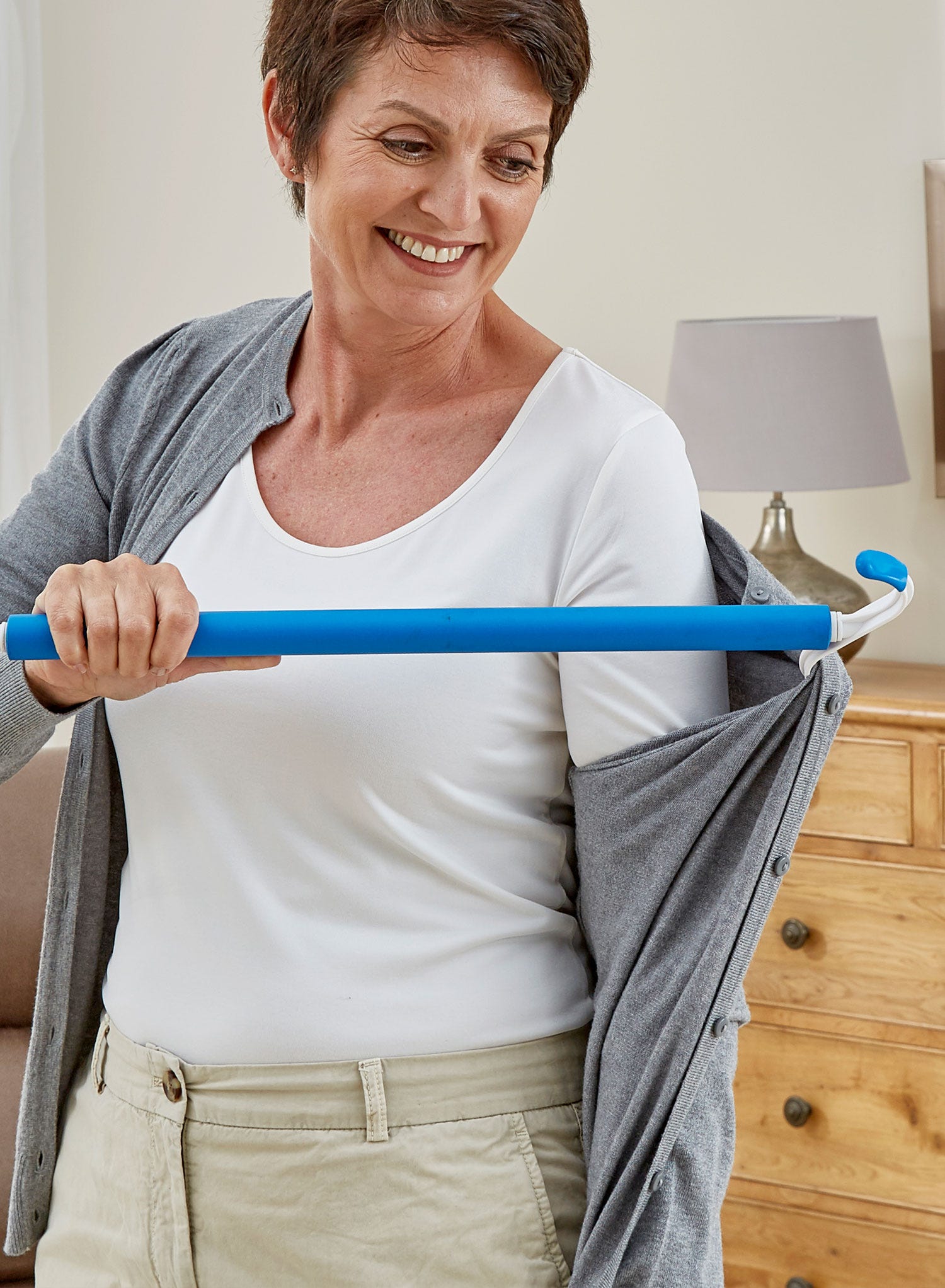 This dressing aid for elderly and disabled people features a soft padded grip, with an S-shaped end for pulling up and pushing off clothes and a shoehorn on the opposite end to help with getting your shoes on. The 61cm long shaft means no more awkward and painful bending and twisting.