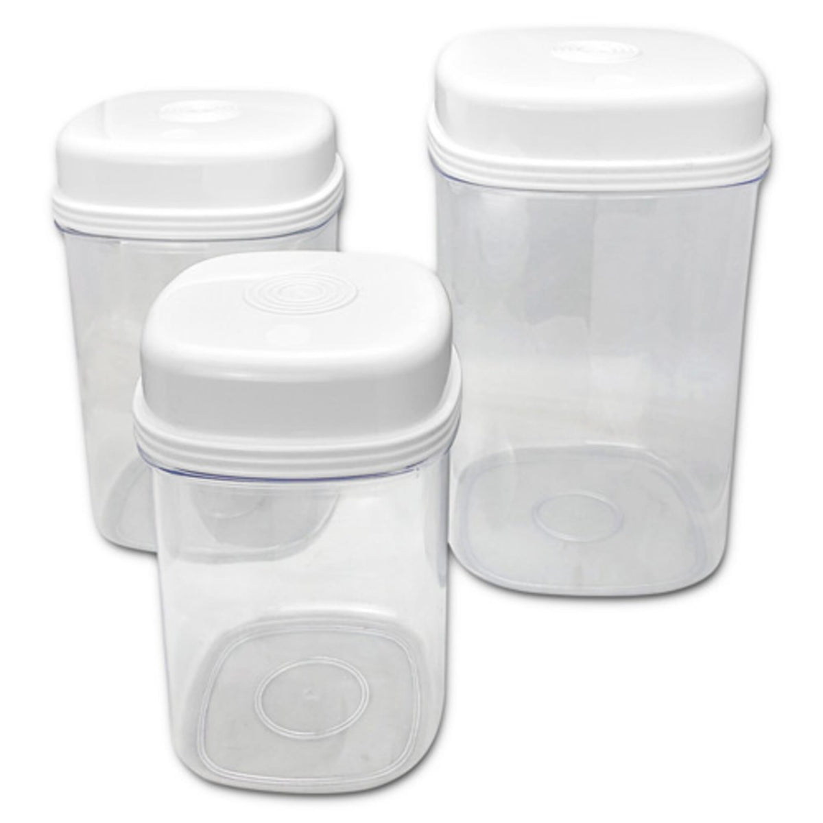 These containers are ideal for children, disabled users, the elderly or anyone with weak hands thanks to it's easy to open lid that involves no turning or twisting. These very easy to use containers are easily opened by pressing the little circle on the rim with your hand or finger. It can be easily resealed by simply applying pressure to the middle of the lid. The containers are transparent so users can clearly see what is being stored as well as being dishwasher safe. The containers are suitable to store foods and keep items such as sugar, biscuits and coffee etc fresh. They are also ideal to hold small items like beads and cotton reels. The containers fit inside one another so when they are not needed and stored away they will take up very little room.