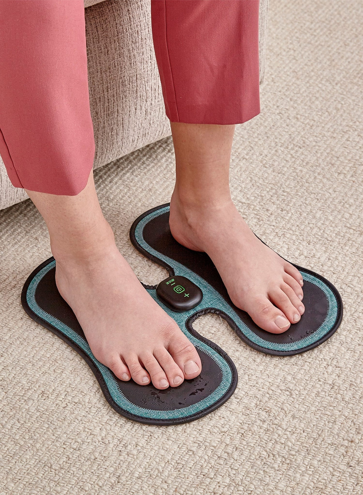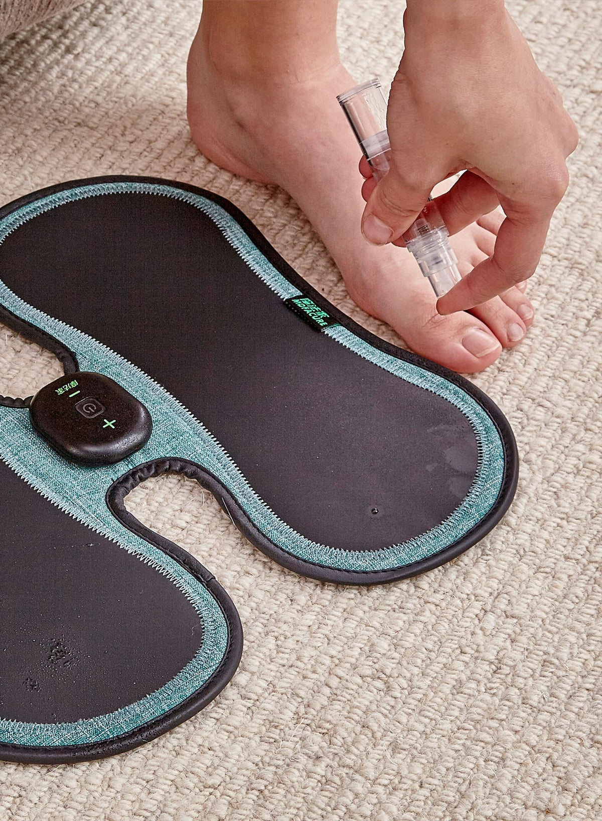 - Before first use, spray the conductive silicone with water first. Place your feet on the conductive area and turn on the power