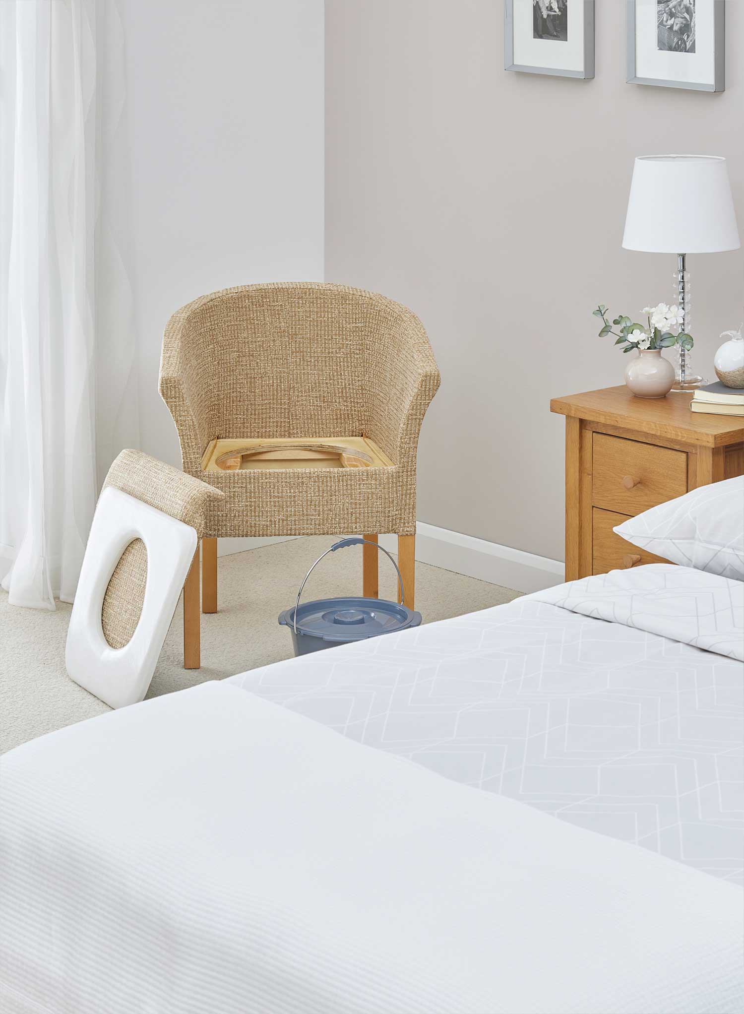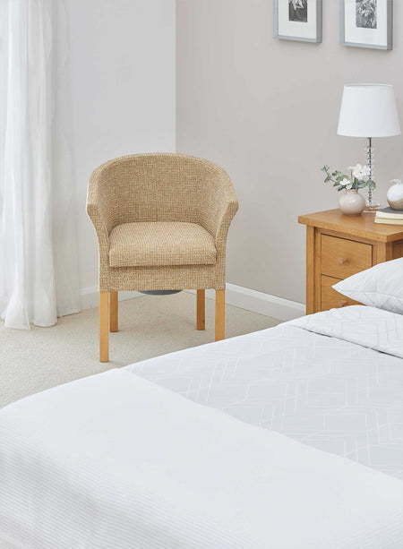 The Exmouth Luxury Commode is designed to blend in as a stylish armchair while discreetly concealing a removable commode pan beneath the comfortable seat cover. This makes it ideal for use in living rooms, bedrooms or other areas where quick access is needed.