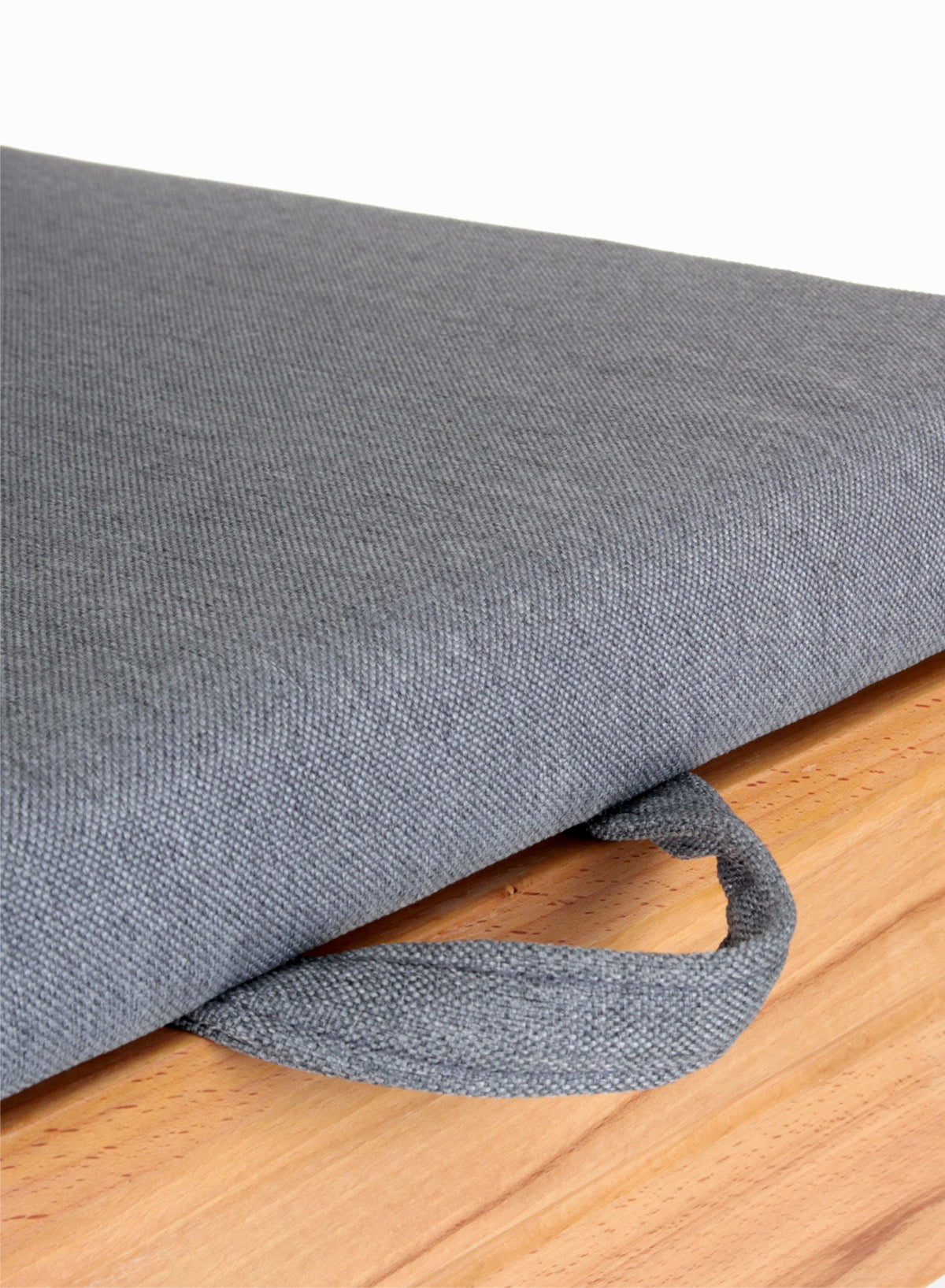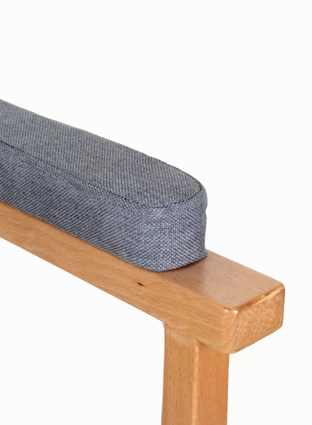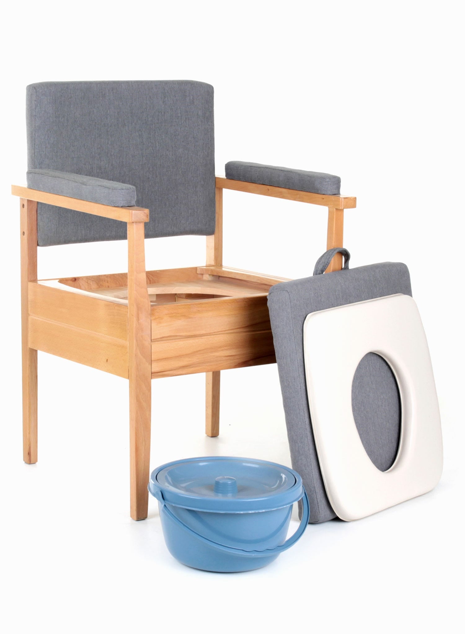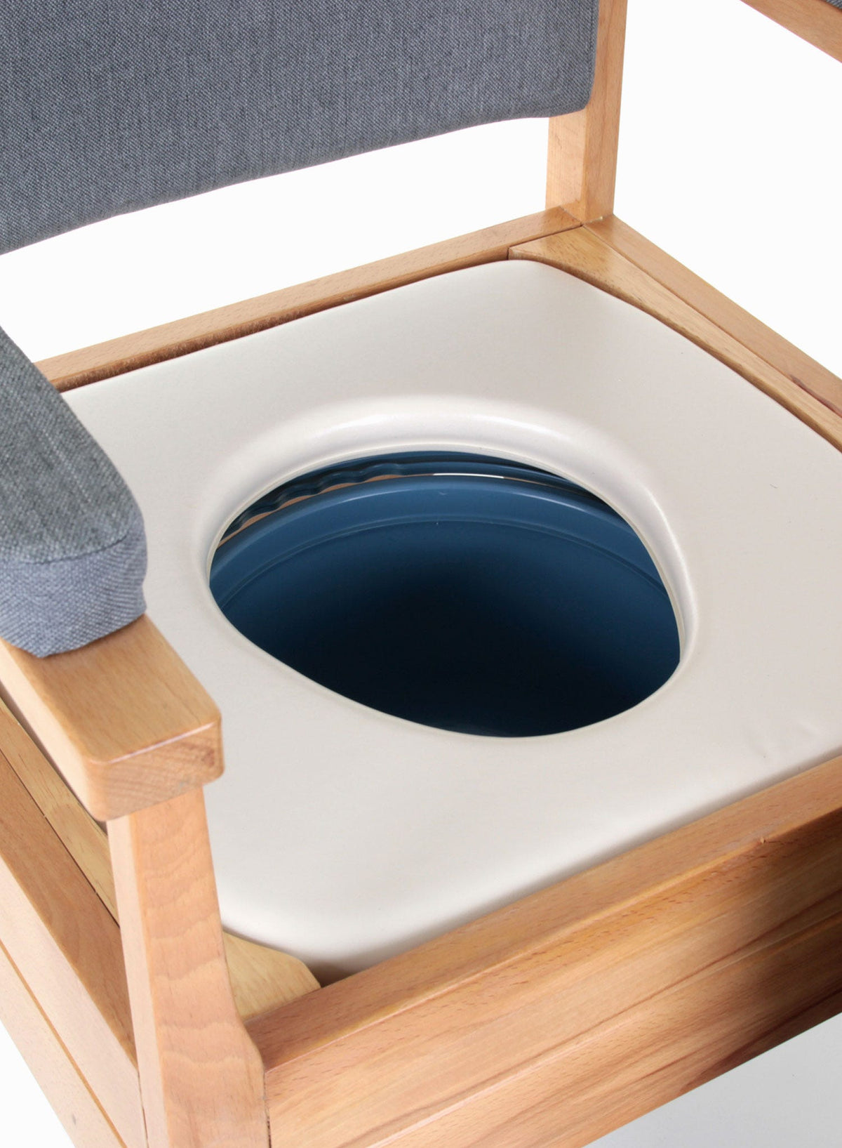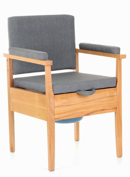 The modern grey fabric seat hides soft vinyl cushioning and a removable commode pan, which is simple to access and clean. This design helps maintain a homely look while still offering essential support.