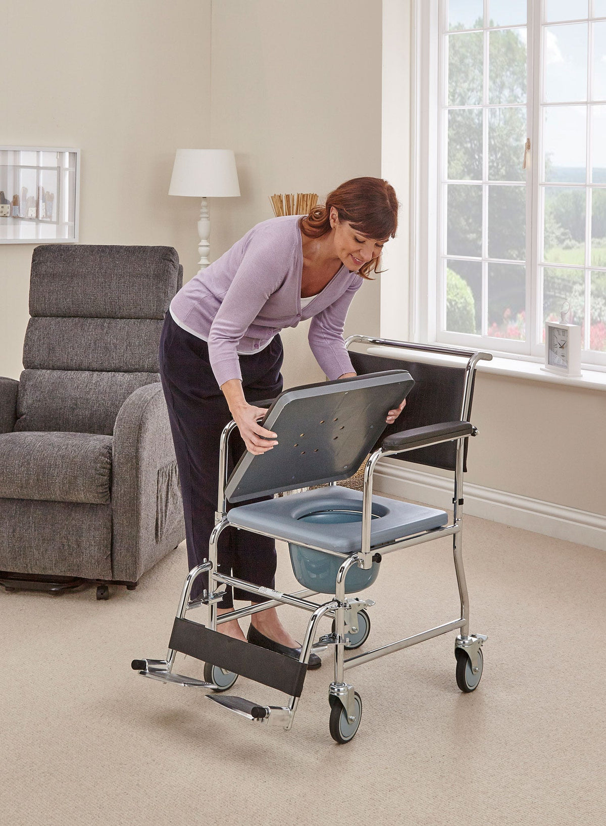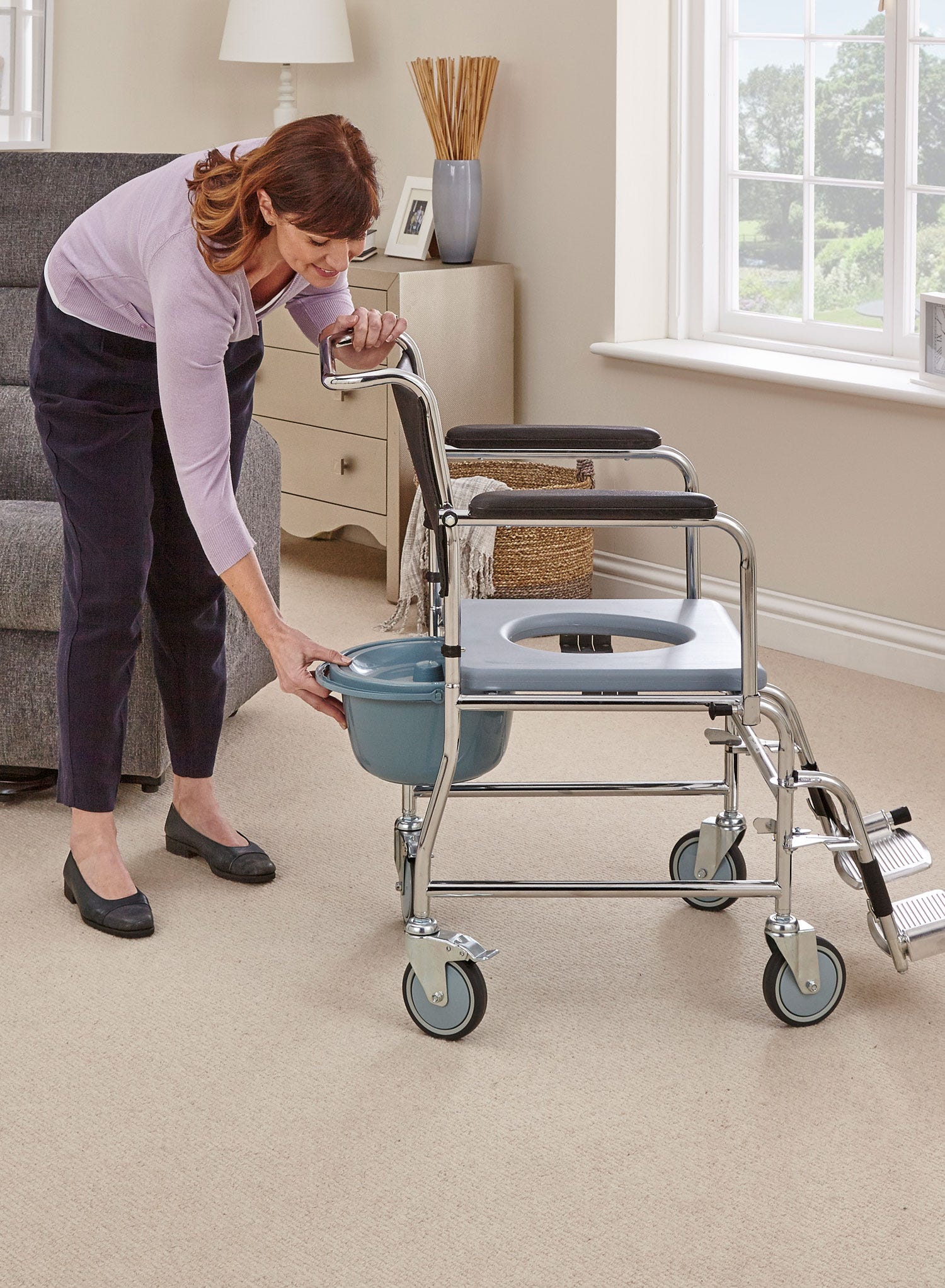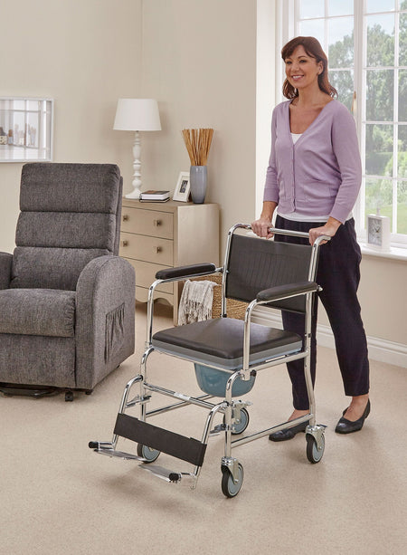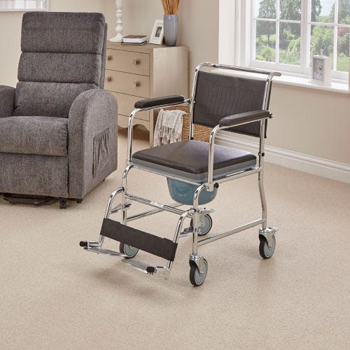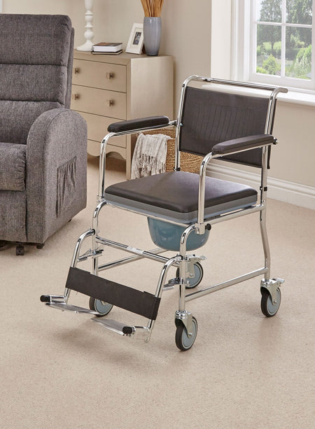 The Mobile Commode is a flexible toileting solution that can be moved wherever it is needed, while also providing a comfortable seat when not in use.