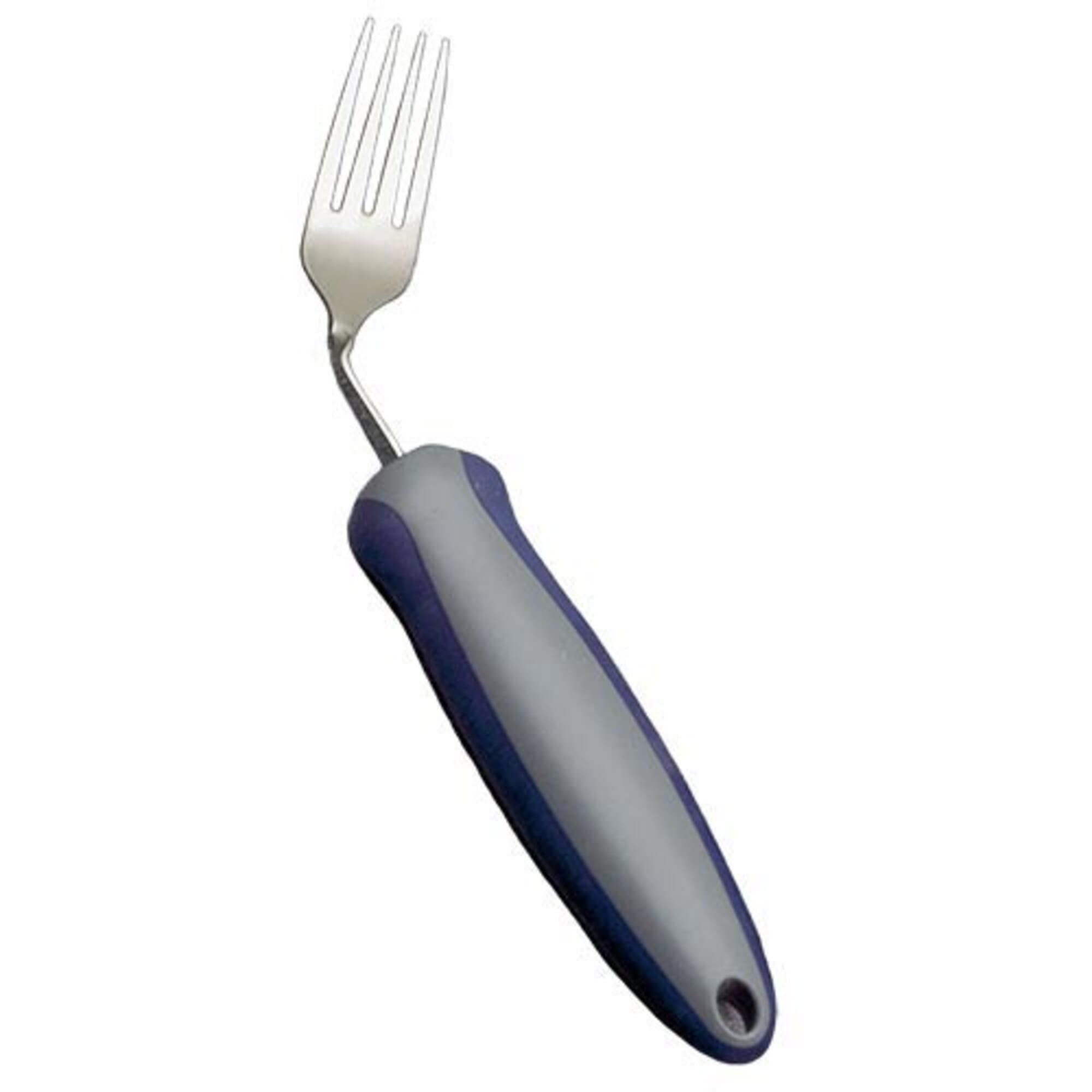 Its ergonomically shaped handle is cushioned to allow the user to hold the utensil firmly but comfortably, even in wet conditions. The fork handle is made from tough plastic with a soft, flexible overmoulding that provides comfort whilst allowing the handle to adapt to the user's grip. The fork head is made from high quality stainless steel. This fork's handle has a rounded shape that allows it to fit naturally into the palm of the hand. This is ideal for conditions such as arthritis, Parkinson's disease, neurological impairments or any condition that can cause poor grip. This angled right handed fork is latex free and also dishwasher safe. Newstead Angled Cutlery is particularly suitable for those with limited wrist or arm movement. This angled fork can be used without cocking the wrist, with a simple motion of the hand.
