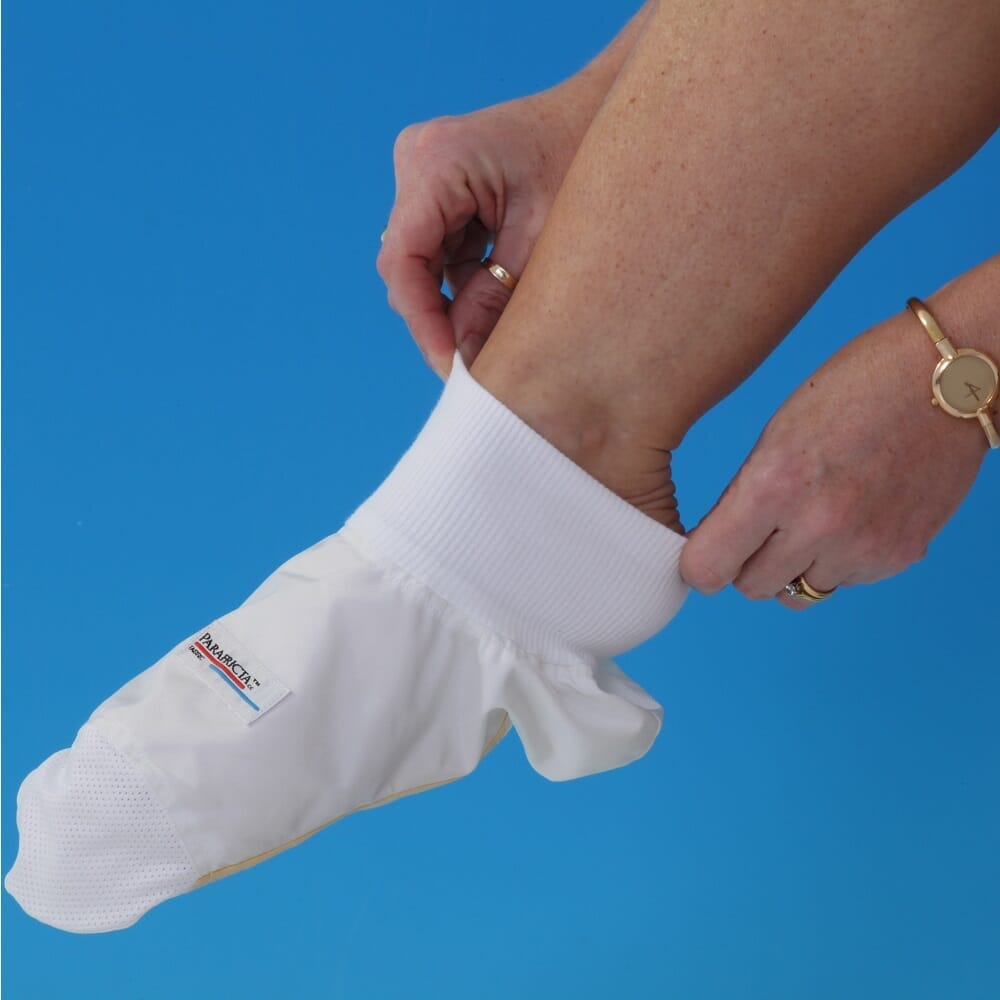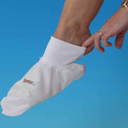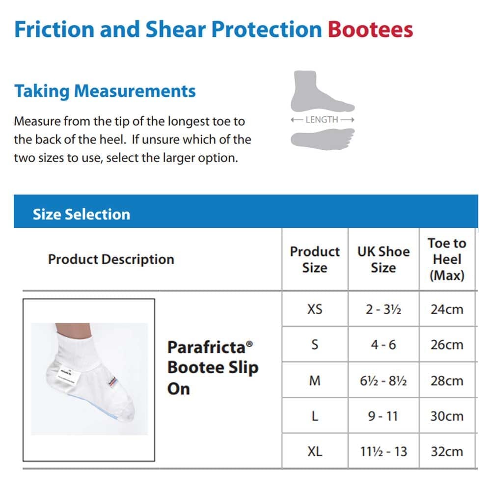 The Parafricta slip-on bootee protects against pressure sores (also known as pressure ulcers or bedsores) caused by friction and the associated shear. This can particularly affect the heel area, for example red, sore or blistered heels as a result of rubbing or dragging on the bed. The bootee also provides non-stop protection to the other most vulnerable areas of the foot and ankle.