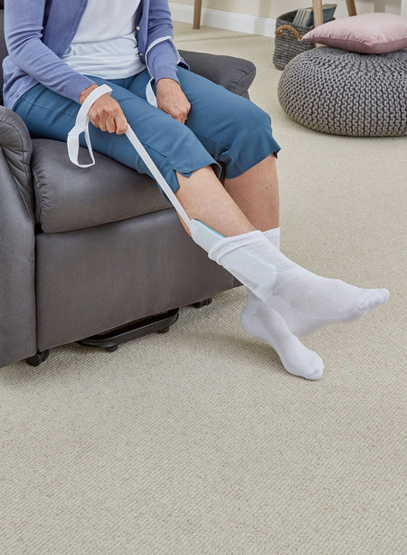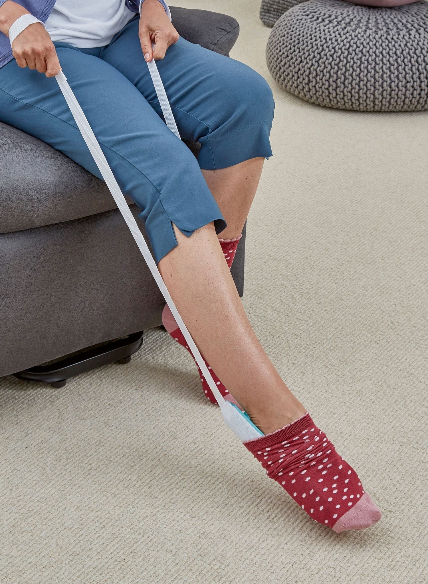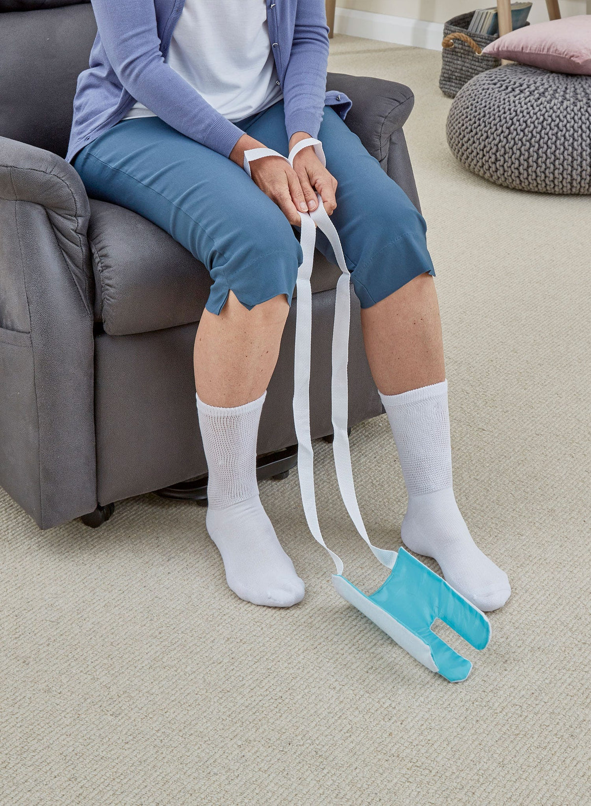 The padded fabric of the Poly Stocking Aid won't damage vulnerable skin on your feet, while the long-reach loop handles are easy to grip.