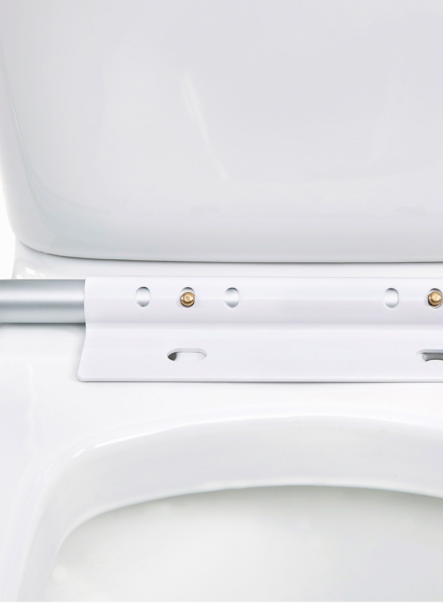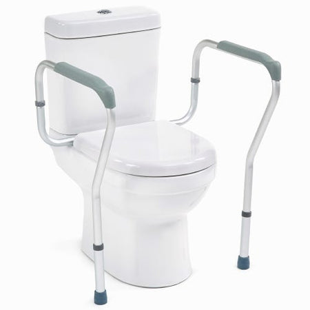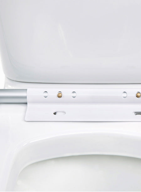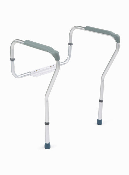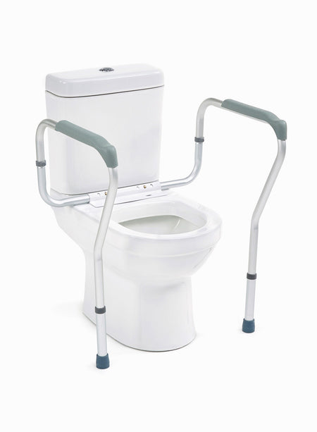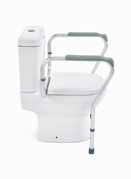 The powder-coated aluminium bracket fixes directly to the toilet using the existing seat-fixing holes, helping the frame stay firmly in place when you sit down or stand up.