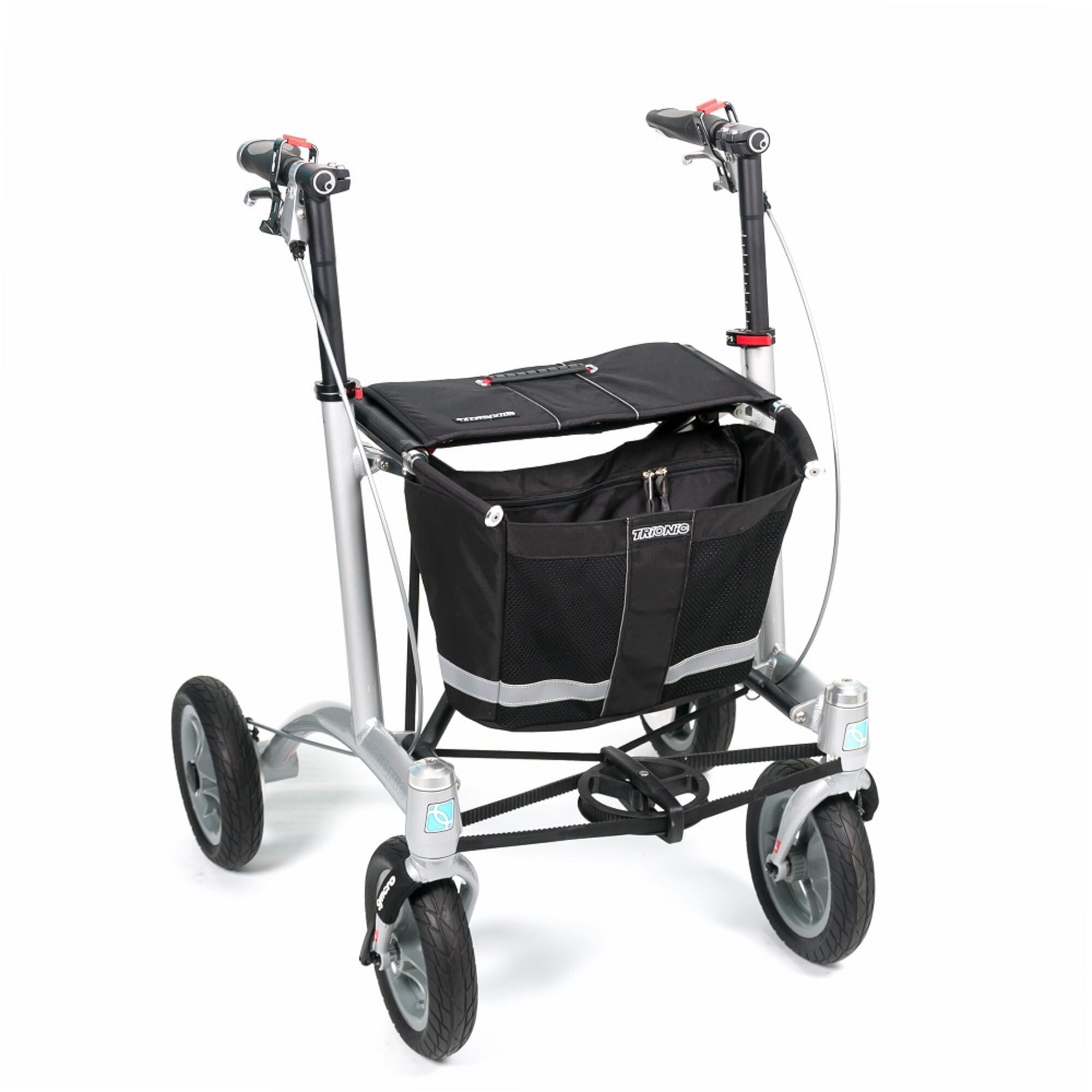 The Trionic Rollator Walker is fitted with a synchronised steering system which keeps the wheels aligned as you move. And when you’re out and about you can make use of the integrated water-repellent basket to carry your shopping and personal items. There is also a 360° reflective band on the basket for safety, to help you be seen on darker days and evenings.