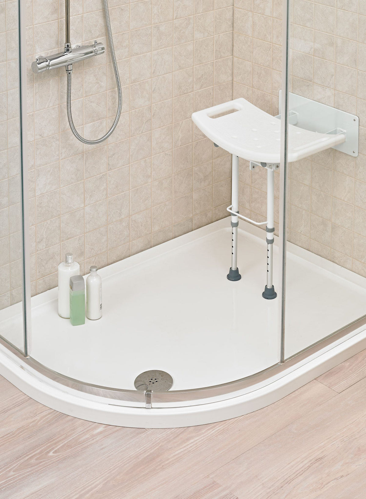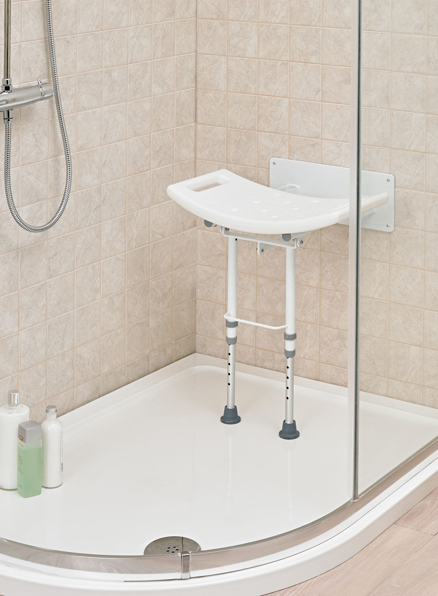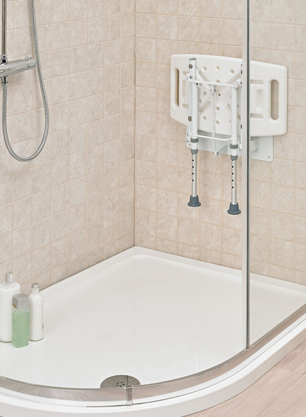 When not in use, the chair folds neatly against the wall, making it perfect for shared or smaller bathrooms. When folded down, the moulded plastic seat provides a gently curved, supportive surface with drainage holes to help water run away and make cleaning easier.