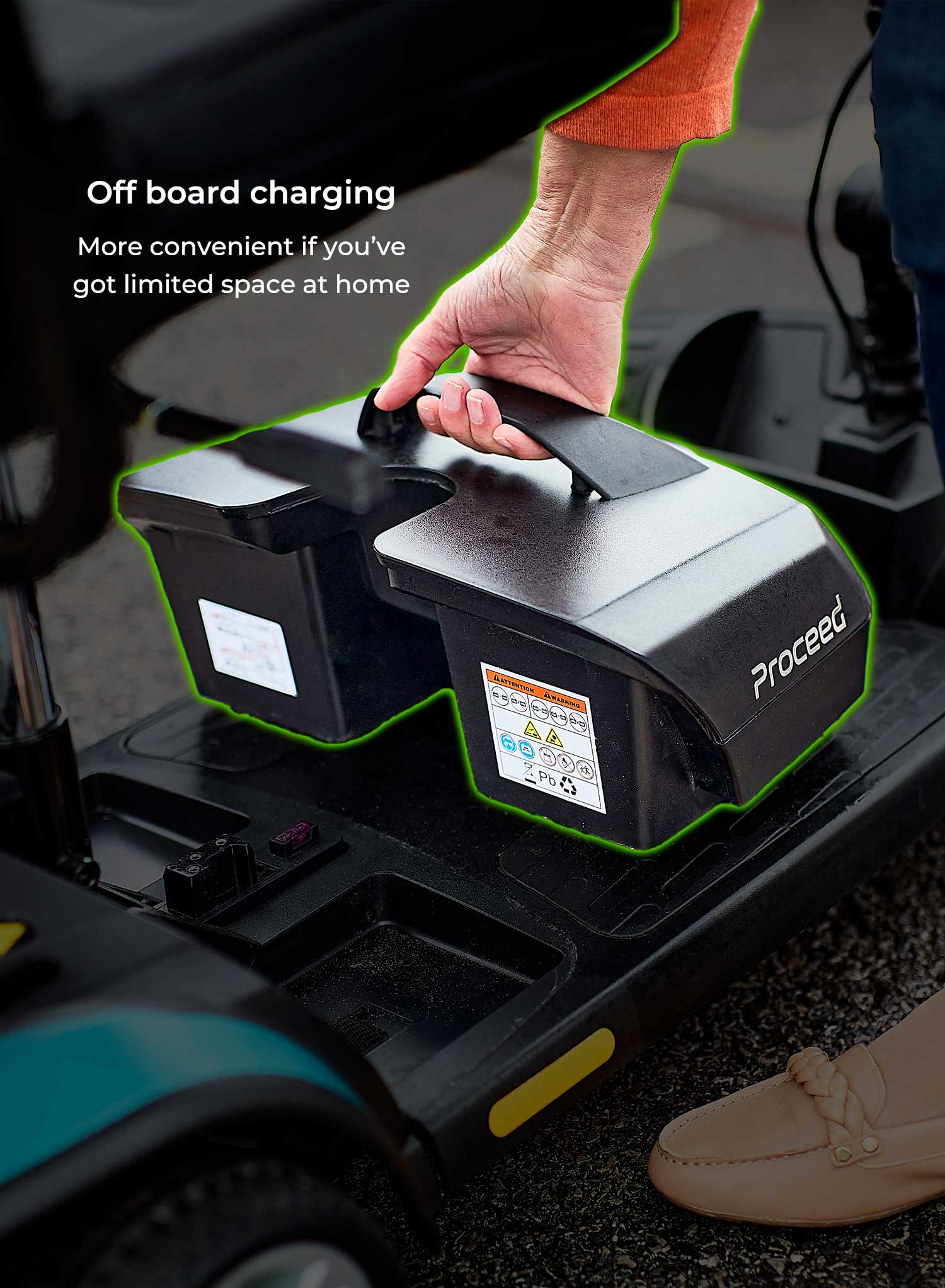The X-Go Proceed uses two 12Ah batteries that can let you travel up to 10 miles on one charge. The off-board charging means you can charge the batteries without having to bring the entire scooter with you – handy if space is at a premium.